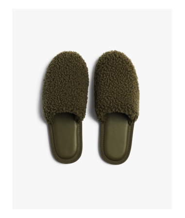 These fuzzy slides are crafted in collaboration with esteemed AD100 designer, Jake Arnold. Part slipper, part shoe – they’re as chic at your bedside as they are stepping out of the house. Made from shearling wool in a rich olive hue for cozy toes and effortless style.