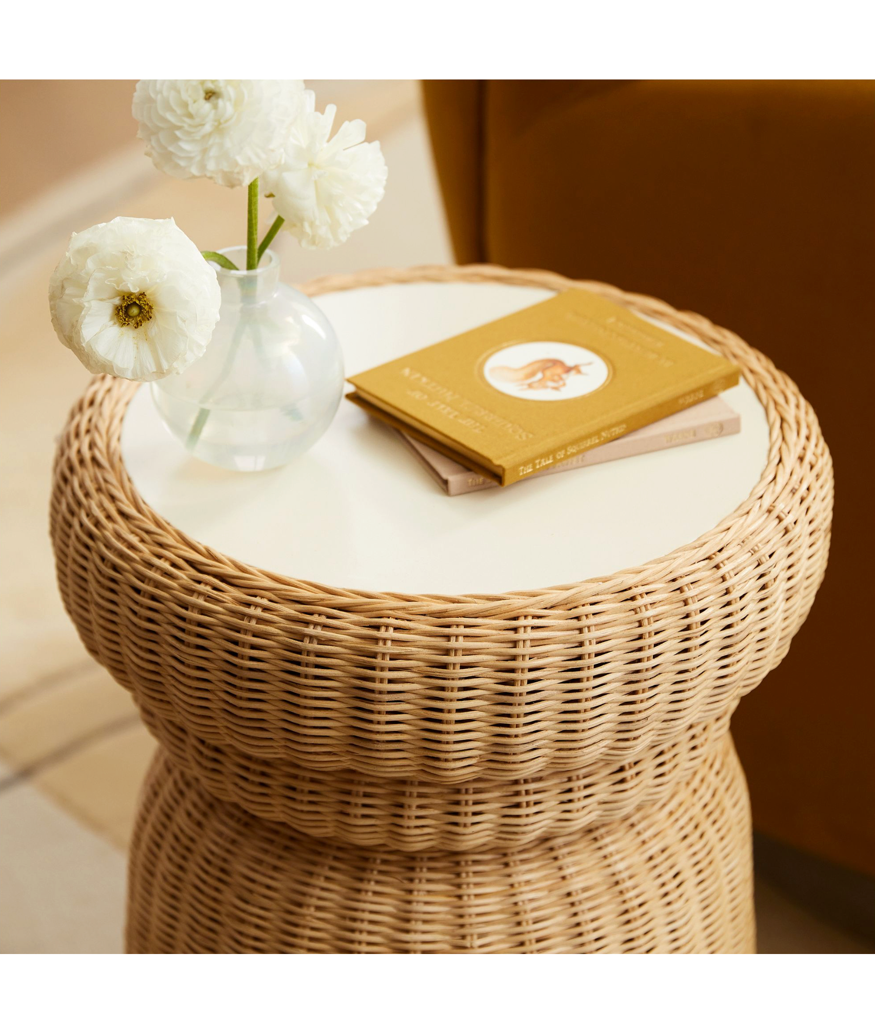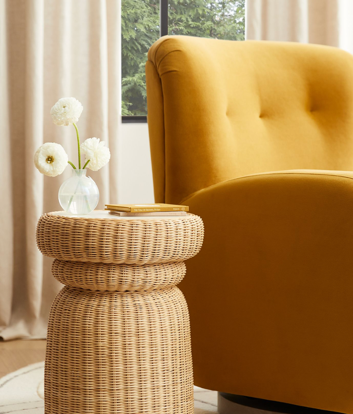 Inspired by organic curves and postmodern design, this is a side table that stands out. It features a simple conical base with two slabs of white marble layered to create a round top. Leave the lower shelf bare to add dimension and highlight its unique silhouette. Fan favorite